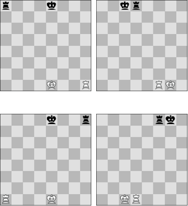 Augšā pa kreisi - stāvoklis pirms balto rokādes karaļa spārnā, melno rokādes dāmas spārnā. Augšā pa labi - stāvoklis pēc balto rokādes karaļa un melno rokādes dāmas spārnā